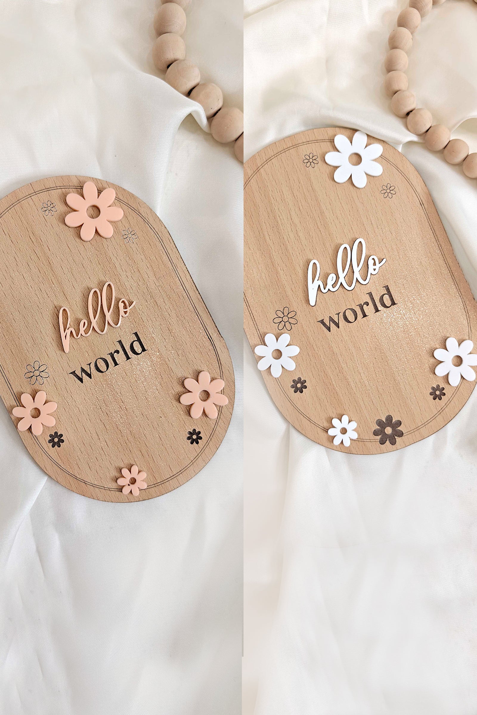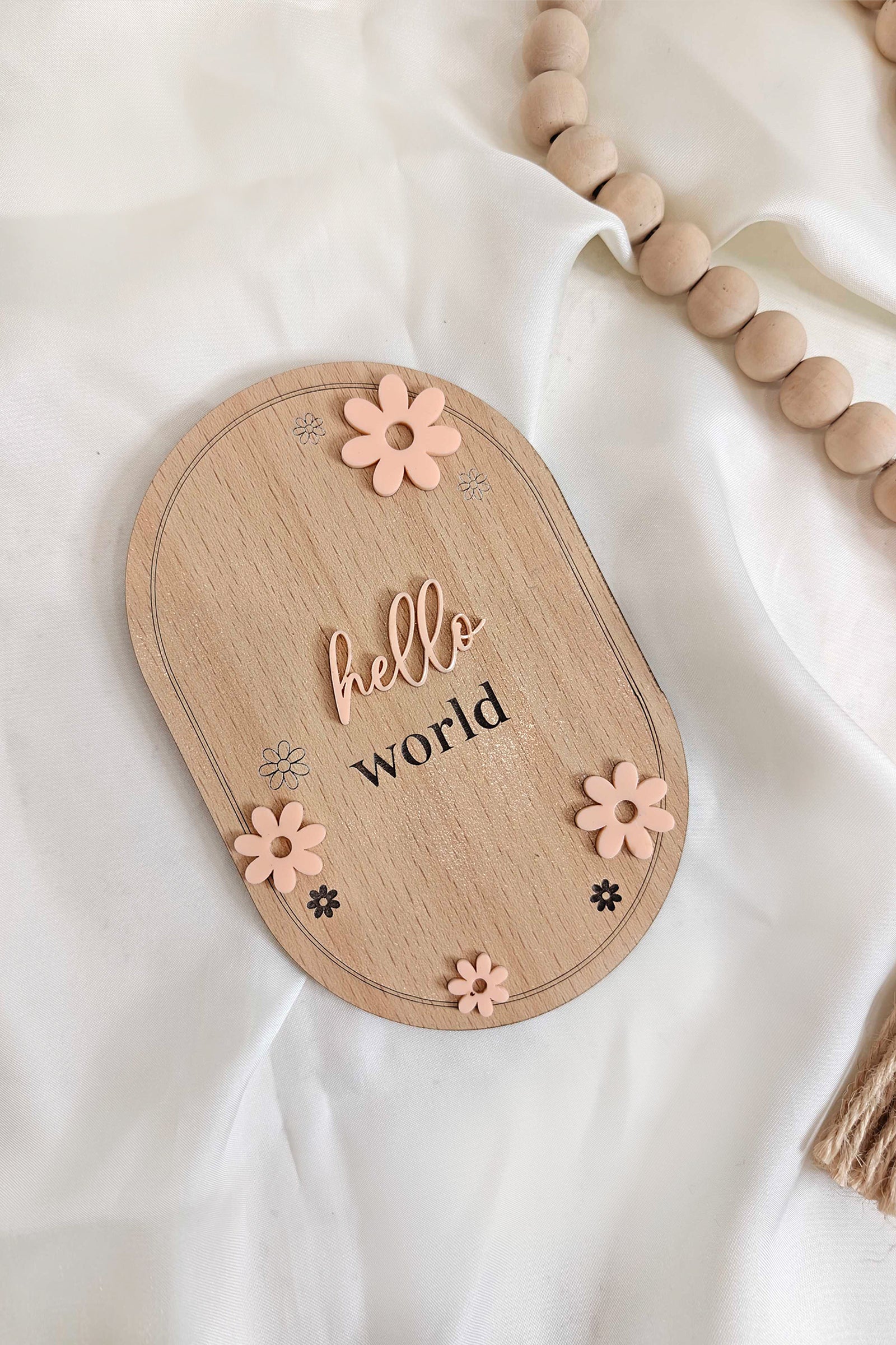 The Hello World Oval Plaque is a gender-neutral baby plaque that is perfect for commemorating the arrival of your new bundle of joy. The plaque serves as a great photo prop for your baby's first photo, and the "Hello World" sign adds the perfect touch for newborn photos, pregnancy announcements, and baby shower gifts.